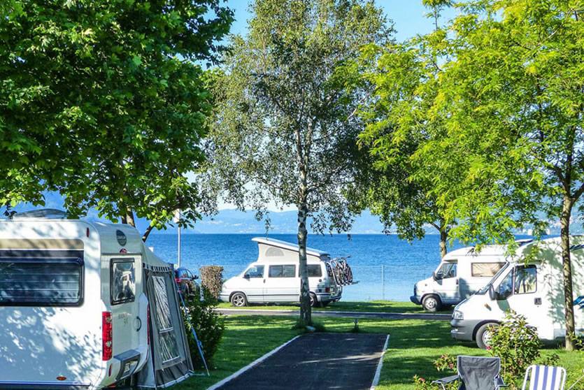 Kleiner Campingplatz welcher auch einige Apartments anbietet mit direktem Strandzugang. Mit Laubbäumen bewachsenes, durch eine kleine Zufahrtsstraße zweigeteiltes Wiesengelände. Etwa 80 m langer und bis zu 3 m breiter, öffentlicher Kiesstrand mit angrenzender Liegewiese.